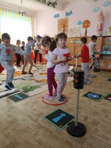 Екипът на детската градина започва работата си по НП “Хубаво е в детската градина” с педагогически ситуации за обучение по безопасност на движението по пътищата. Постелките с разнообразни илюстрации помагат в изучаването на БДП. Педагозите комбинират задачи за изучаване на БЕЛ с теми по Околен свят, описващи различни предмети и животни – децата трябва да имитират самолет, зайче или риба.